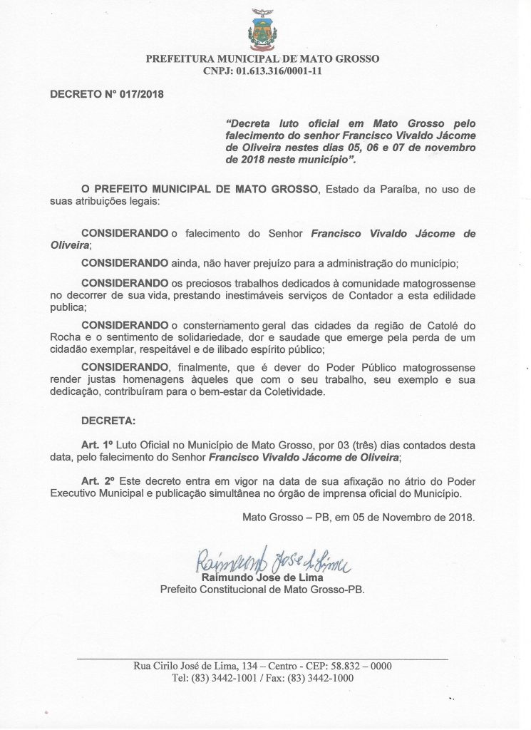 A Prefeitura de Mato Grosso decretou luto oficial de três dias pela morte de Francisco Vivaldo Jácome de Oliveira, ocorrido nesta segunda-feira (5), na cidade de Natal, no Rio Grande do Norte. O Decreto foi assinado pelo prefeito Raimundo José de Lima que também externou solidariedade à família de Valdinho.