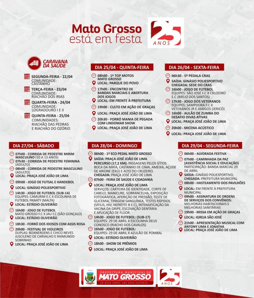 O Prefeito Raimundo José de Lima, e todos que fazem a Administração Municipal têm a satisfação de convidá-los (as) para participarem da programação alusiva à comemoração dos 25 anos de Emancipação Política de Mato Grosso que acontecerá entre os dias 25 a 29 de Abril.