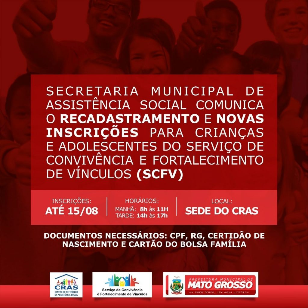 A Secretaria Municipal de Assistência Social de Mato Grosso informa que já iniciaram as atividades de recadastramento e inscrições de novos usuários do Serviço de Convivência e Fortalecimento de Vínculos (SCFV).